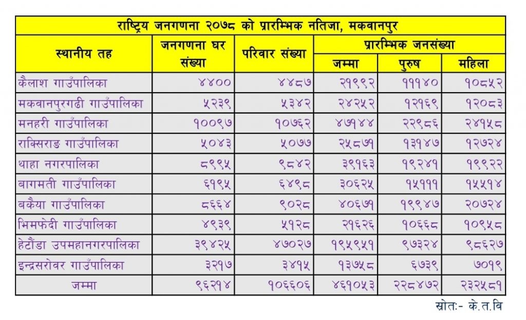 मकवानपुरको जनसंख्या ४ लाख ६१ हजार ५३