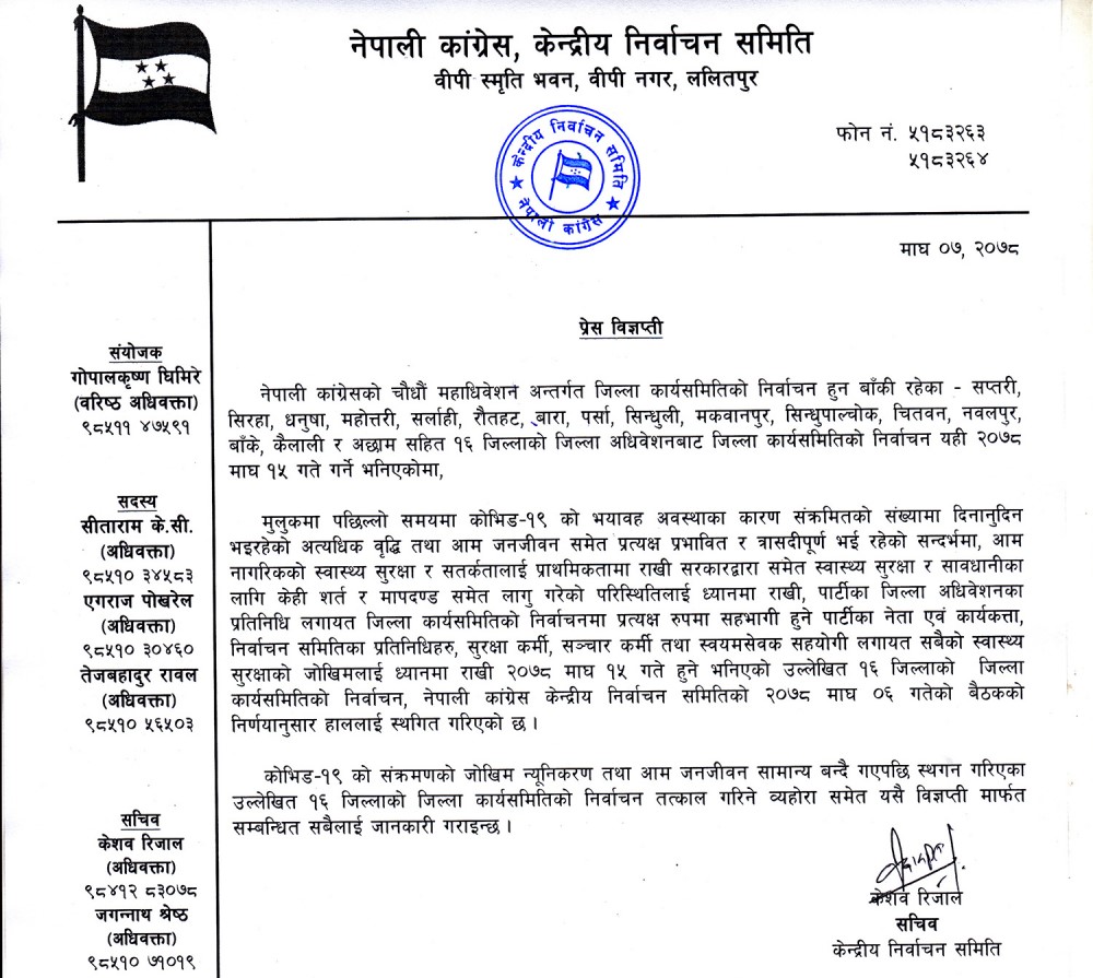 कांग्रेसको १६ जिल्लाको निर्वाचन स्थगित