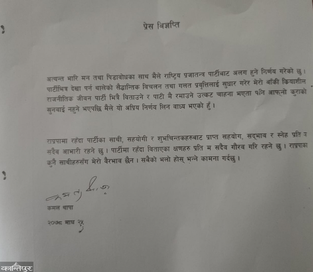 हेटौंडा – राष्ट्रिय प्रजातन्त्र पार्टी (राप्रपा) का निवर्तमान अध्यक्ष कमल थापाले पार्टीबाट अलग भएको घोषणा गरेका छन् । मंसिरको अन्तिम साता भएको पार्टी महाधिवेशनमा अध्यक्षमा पराजित भएसँगै थापा असन्तुष्ट रहँदै आएका थिए । आज हेटौँडामा आयोजित पत्रकार सम्मेलनमा उनले पार्टीबाट अलग हुने घोषणा गर्रेका हुन् । थापाले मंगलबार एक विज्ञप्ति जारी गरी पार्टीभित्र सैद्धान्तिक विचलन र गलत प्रवृत्ति हावी भएको त्यसलाई सुधार गरेर जाने आफ्नो चाहनाको सुनुवाइ नभएकाले अत्यन्त भारी मन र पीडाबोधका साथ पार्टीबाट अलग हुने निर्णय गरेको बताएका छन् ।