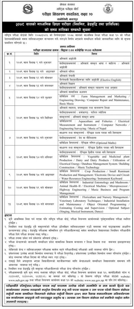 राष्ट्रिय परीक्षा बोर्डले यस वर्षको माध्यमिक शिक्षा परीक्षा (एसईई)को तालिका (रुटिन) बिहीबार सार्वजनिक गरेको छ।रुटिनअनुसार ९ वैशाखमा अनिवार्य अंग्रेजी, अनिवार्य संस्कृत र साहित्यको परीक्षा हुनेछ।यस्तै, परीक्षाको अन्तिम दिन फ्लोरिकल्चर एन्ड नर्सरी म्यानेजमेन्ट, भेटेनरी ल्याबोरेटरी टेक्निकलगायत प्राविधिक विषयतर्फको परीक्षा सञ्चालन हुनेछ।११ वैशाखमा ११ गते अनिवार्य गणित, १२ वैशाखमा अनिवार्य नेपालीको परीक्षा हुनेछ। सबै परीक्षा बिहान ८ देखि ११ बजेसम्म सञ्चालन हुने छन्।