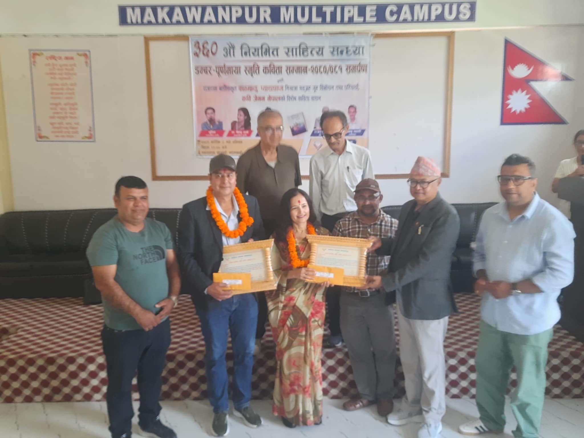 हेटौंडा- साहित्य संगम मकवानपुरको ३६० औँ नियमित साहित्य सन्ध्या विशेषसमारोहका रुपमा शनिबार सम्पन्न भएको छ । कार्यक्रममा डम्बर–पूर्ण माया स्मृति सम्मान समर्पणका साथै नियात्राकार राजाराम बर्तौलाको ‘काठमाण्डु प्याराडाइज’ नियात्रा संग्रहको गृहविमोचन तथा परिचर्चा गरिएको थियो । कार्यक्रममा ‘डम्बर– पूर्णमाया स्मृति कविता सम्मान’ –२०८० बाट बाग्लुङका कवि भूपिन ब्याकुल र २०८१ बाट काठमाडौँकी कवि÷समालोचक डा. बिन्दु शर्मालाई प्रदान गरिएको हो । उनीहरुलाई सम्मानपत्रसहित नगद २२ हजार दुई सय २२ रुपैयाँ प्रदान गरिएको थियो । सम्मानित कविहरुले आफ्ना अनुभव र सृजनात्मक यात्राका प्रसंग प्रस्तुत गर्दै साहित्यले समाजमा चेतना र संवेदना अभिव्यक्त गर्ने माध्यमको रुपमा निरन्तर विकसित हुनुपर्ने विचार व्यक्त गरे ।