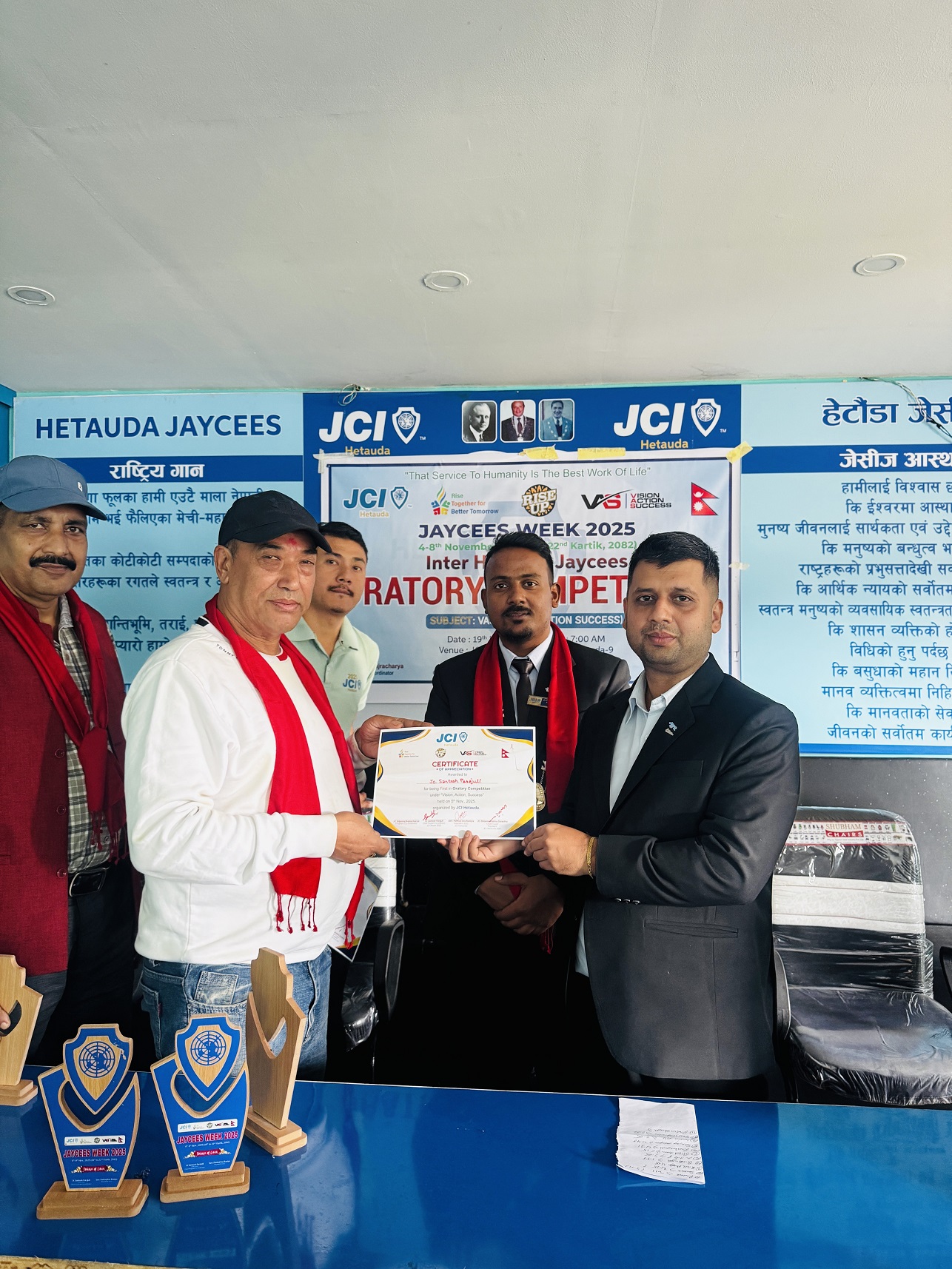 कार्यक्रमको निर्णायक मण्डलमा सन् २००८ र २०१५ का शाखाअध्यक्ष क्रमशः कुश रिजाल र दीपकराज मिश्र रहेका थिए । सन् २०२५ का शाखाअध्यक्ष पंकजदास बानियाँको सभाअध्यक्षतामा सम्पन्न वक्तृत्वकला प्रतियोगिताको संयोजक सृजनराज बज्राचार्य तथा सन् २००१ का पूर्वशाखा अध्यक्ष धर्मकृष्ण श्रेष्ठ प्रमुख अतिथिकारुपमा उपस्थित रहेका थिए । जेसीज सप्ताहको क्रममा यसअघि रक्तदान तथा स्लो मोटरसाइकल रेस सम्पन्न भइसकेको र आगामी दिनमा अन्य सामाजिक एवम् व्यक्तित्व विकासमुखी कार्यक्रम सञ्चालन गरिने जेसीआई हेटौंडाका महासचिव न्यौपानेले जनाए ।