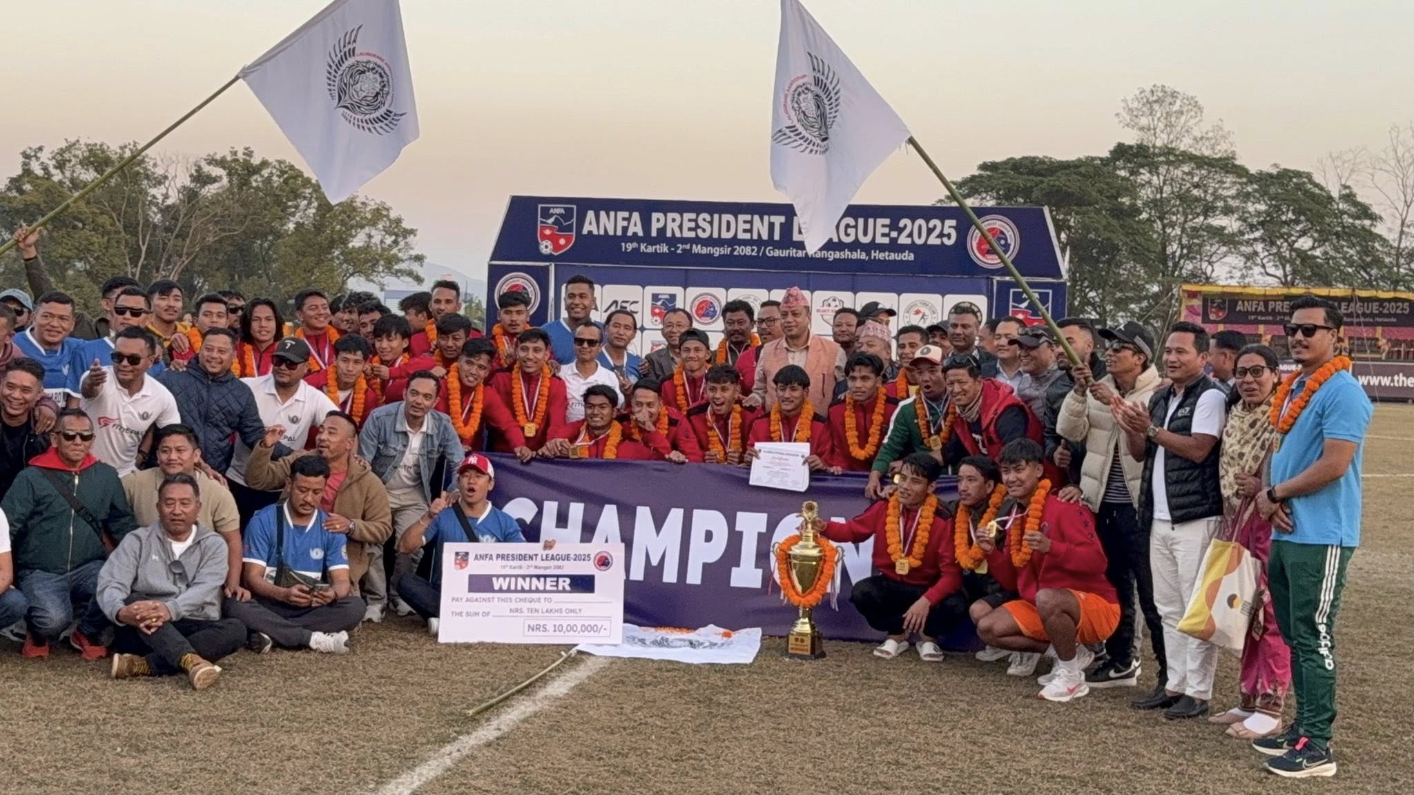 हेटौंडा- कास्कीको लालीगुराँस एसोसियसन क्लबले हेटौंडामा सम्पन्न एन्फा प्रेसिडेन्ट कपको उपाधि जितेको छ ।हेटौंडा–६ स्थित गौरीटार रंगशालामा मंगलबार भएको फाइनल खेलमा काठमाडौंको चित्लाङलाई टाइब्रेकरमा ३–१ ले पराजित गर्दै लालीगुराँसले उपाधि जितेको हो । प्रतिस्पर्धात्मक खेलको निर्धारित समय गोलरहित बराबरीमा टुंगिएपछि खेल टाइब्रेकरतर्फ धकेलिएको हो । खेलमा लालीगुराँसका एन्जल श्रेष्ठ प्लेयर अफ दि म्याच घोषित भए । टाइब्रेकरमा लालीगुराँसको तर्फबाट आशिष गुरुङ, सरोज गुरुङ र लच्छु थापाले गोल गरे भने चित्लाङको तर्फबाट शिशिर लेखीले मात्र गोल गरे । जय गुरुङ, गौरव श्रेष्ठ र मदन स्याङतानको प्रहार बिफल भएका थिए ।