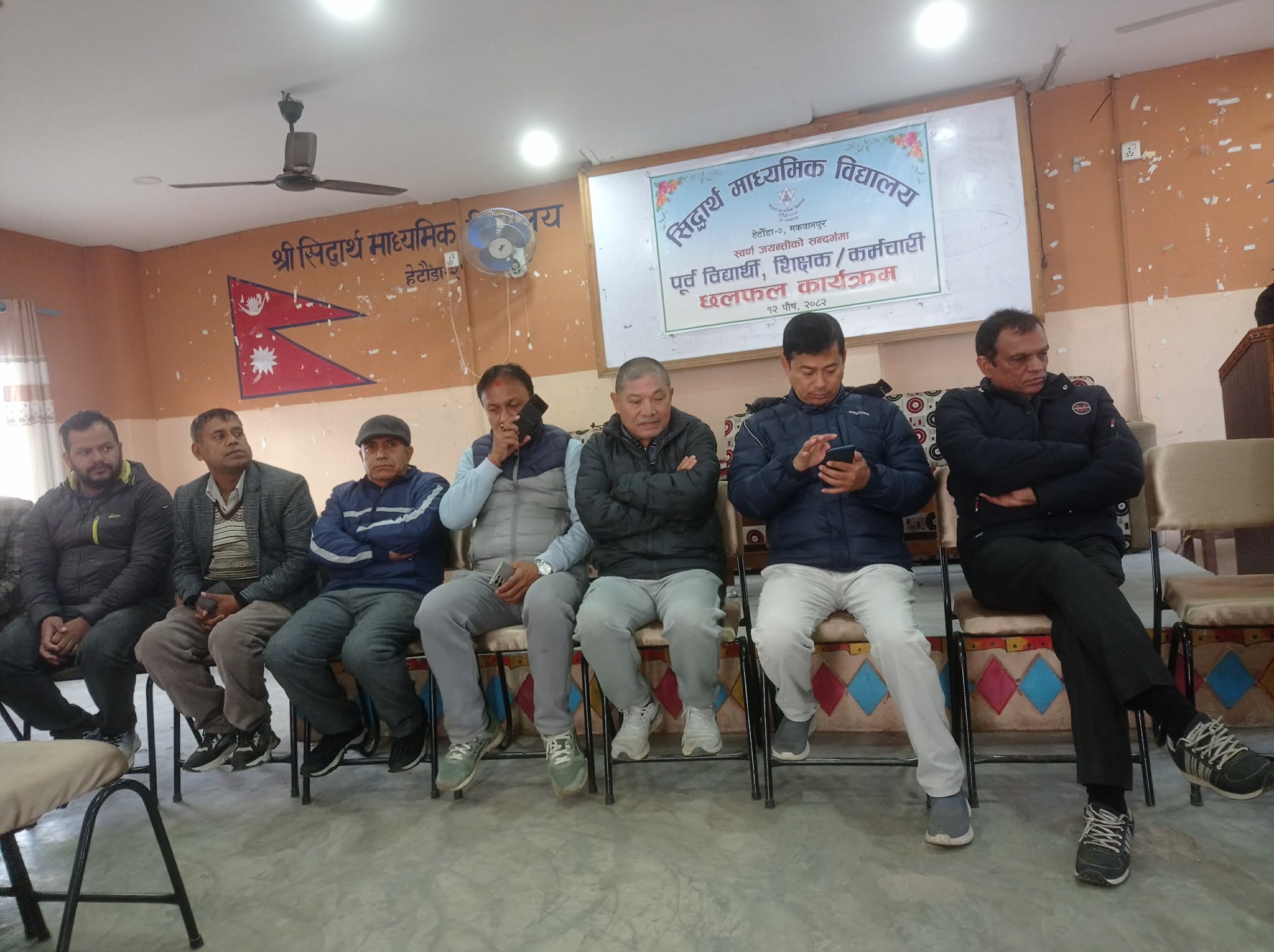 हेटौंडा-हेटौंडा उपमहानगरपालिका–२ स्थित सिद्धार्थ माध्यमिक विद्यालयले स्थापनाको ५० औँ वर्षको अवसरमा स्वर्ण जयन्ती मनाउने भएको छ । आगामी माघ २ गतेदेखि ८ गतेसम्ममा विविध कार्यक्रमको आयोजना गरी स्वर्ण जयन्ती मनाउने भएको हो । स्वर्ण जयन्तीको तयारीको क्रममा विद्यालयले शनिबार विद्यालयको हलमा पूर्वविद्यार्थी, शिक्षक र कर्मचारीसँग छलफल गरेको छ । छलफलमा स्वर्ण जयन्ती समारोहमा विद्यालयसँग विगत र वर्तमानमा जोडिएका सबै पक्षलाई समेट्दै अपनत्व महशुस गर्ने गरी मनाउन र विद्यालयको भावी दीर्घकालीन योजनाको खाका बनाउन सहभागीहरुले सुझाएका थिए ।